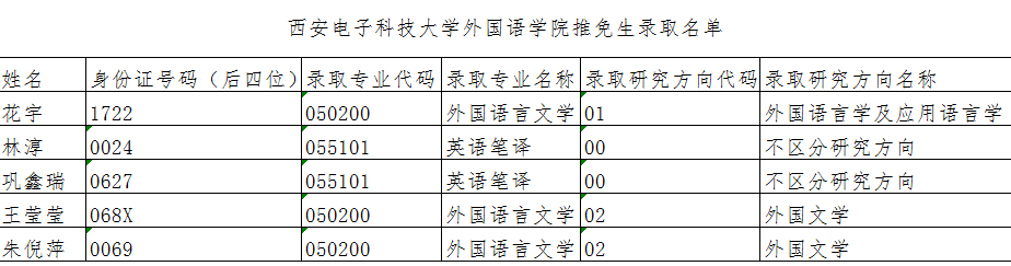 外国语学院2022年推免生录取工作现已结束,根据有关规定,现将拟录取名单予以公示,公示期为即日起10个工作日。公示期内,如有异议请向学院反映,联系电话:029-81891383。